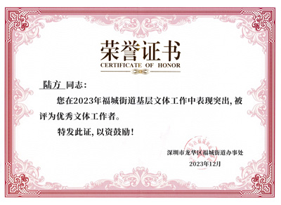 熱烈祝賀我司鐵保宏泰深圳保安公司安保隊(duì)長陸方同志榮獲2023年度深圳市龍華區(qū)福城街道基層文體工作表現(xiàn)突出獎(jiǎng),被評(píng)為優(yōu)秀文體工作者。