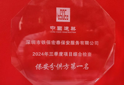 熱烈祝賀我司鐵保宏泰深圳保安公司在中建五局華南公司深圳分公司2024年第三季度綜合檢查頒獎(jiǎng)儀式中榮獲保安分供方第一名!