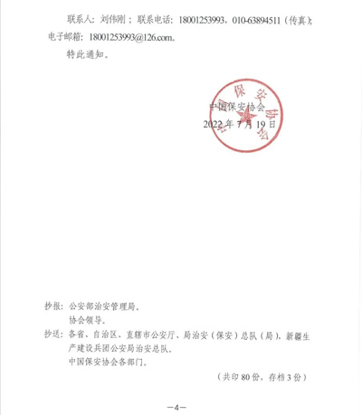中國(guó)保安協(xié)會(huì)發(fā)布《關(guān)于組織做好保安行業(yè)主題日宣傳活動(dòng)的通知》(中保協(xié)【2022】13號(hào)),通知指出,公安部治安管理局決定在7月24日組織開展以“喜迎二十大、保安護(hù)平安”為主題的全國(guó)保安行業(yè)主題日宣傳活動(dòng)。